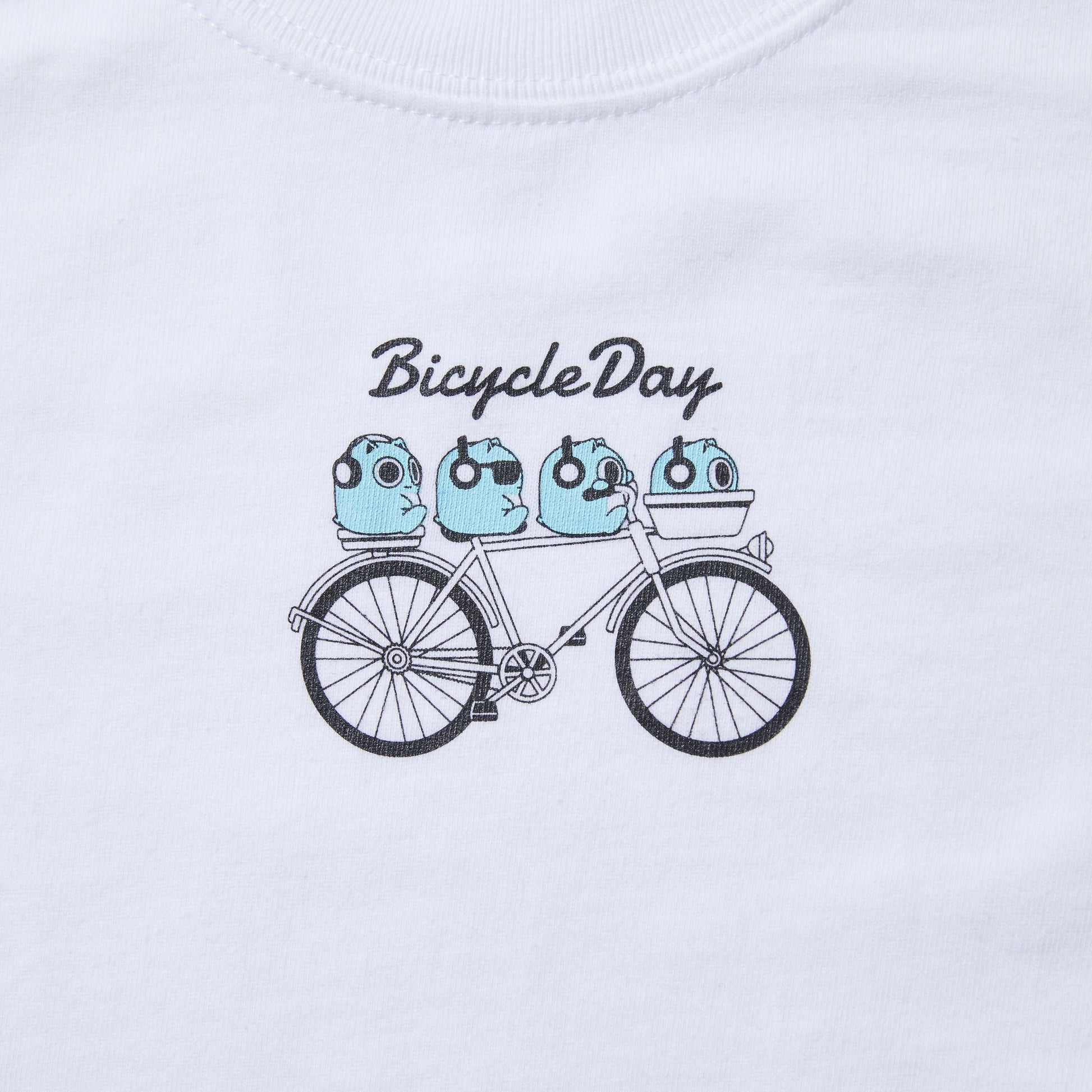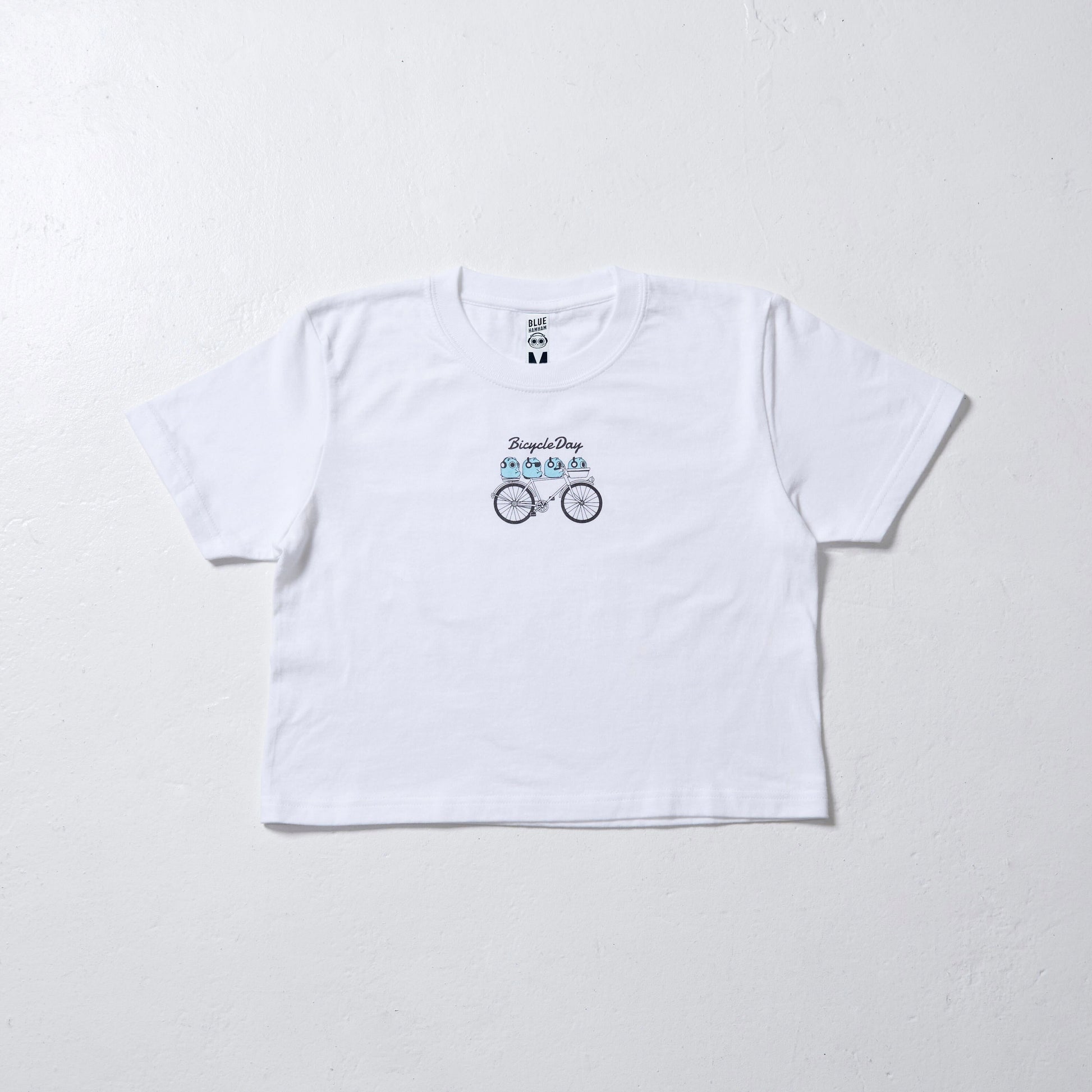 ハイウエストのボトムスとの相性抜群なクロップドTシャツ。体にフィットするサイズ感でスタイルアップ効果もあり、すっきり軽やかに着こなせる1枚です。フロントには自転車に乗っているブルーハムハムのデザインをあしらいました。